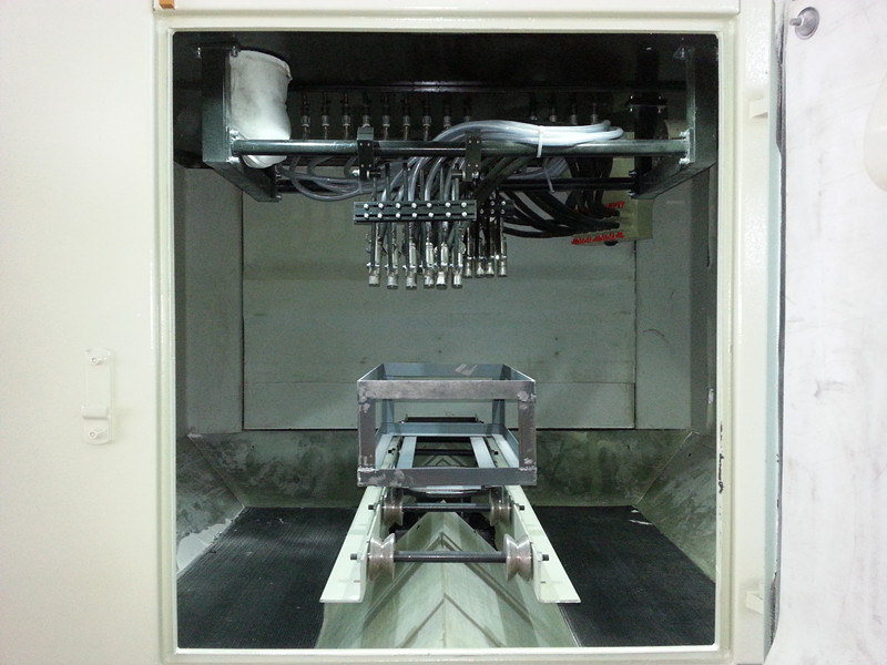 該設(shè)備是根據(jù)不銹鋼水槽產(chǎn)品特性而專門設(shè)計的(非標(biāo)準(zhǔn)型)轉(zhuǎn)動式自動噴砂機(jī),完全適合購方所提供的產(chǎn)品。根據(jù)購方對產(chǎn)品效率的要求,設(shè)備采用轉(zhuǎn)動推車式噴砂機(jī)。